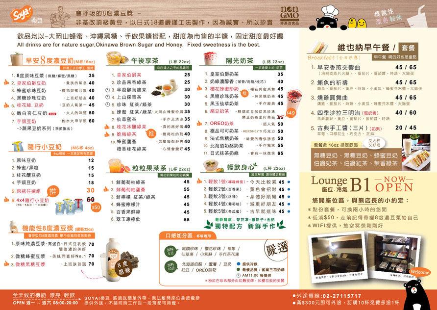 台北市大安區延吉街137巷22號1F 外送電話:02-27115717 外送傳真:02-27117317 營業時間:星期一~星期六 08:00 ~ 20:00 (星期日公休) 來信 bear@soyaaa.com 和熊店長聊聊天